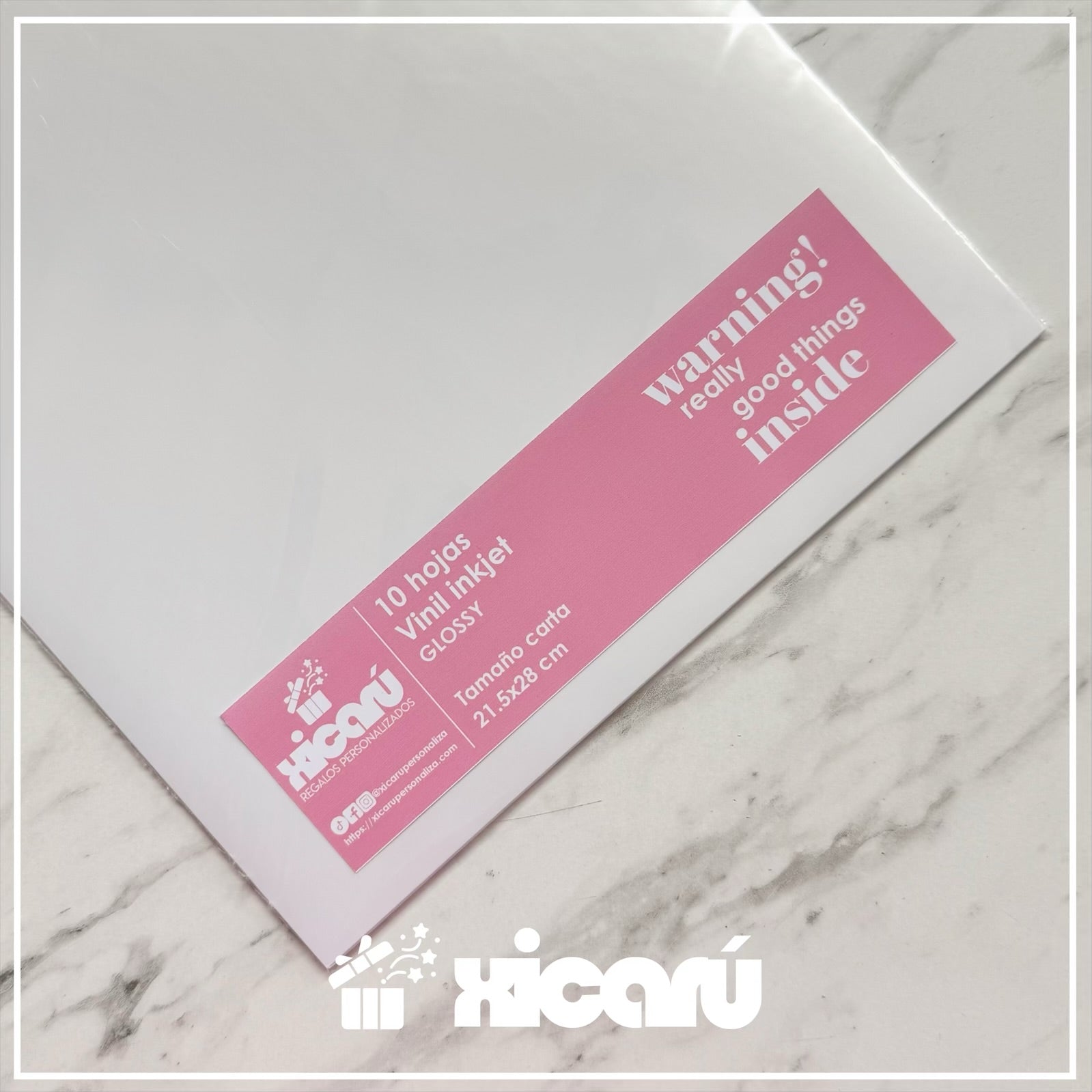 Contiene 10 hojas de vinil imprimible en inkjet, tipo glossy (brillante). Tamaño Carta.