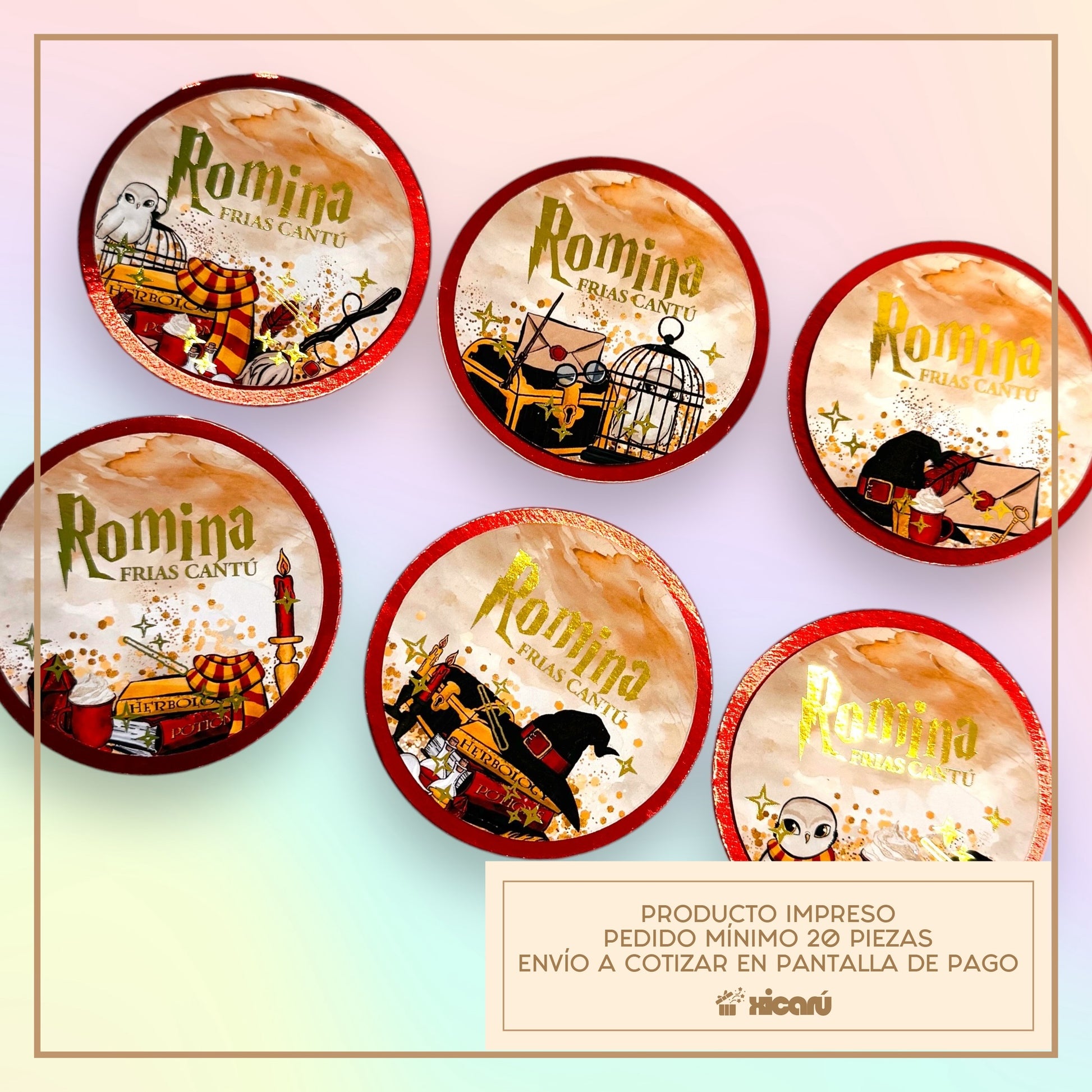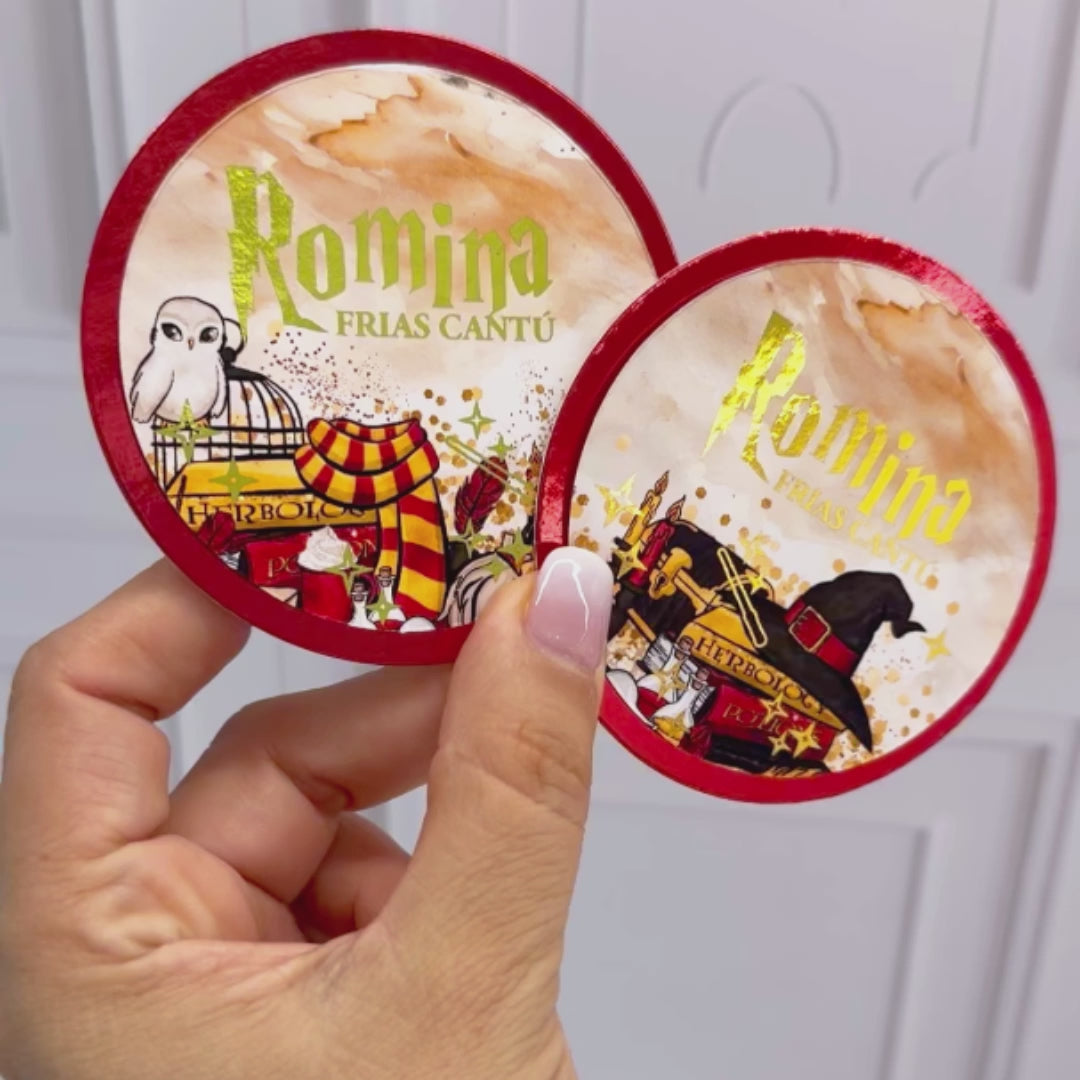 Tarjetas personalizadas con tema de Griffyndor de Harry Potter, tal como se ve en la foto, no incluye cambios en el diseño gráfico. La personalización incluye efecto metálico en el nombre (todos iguales).