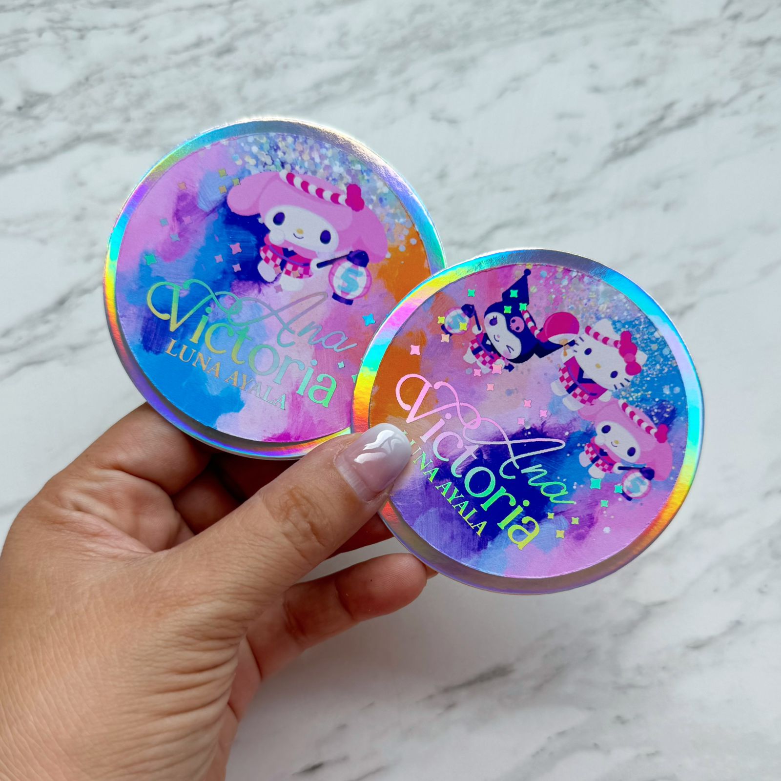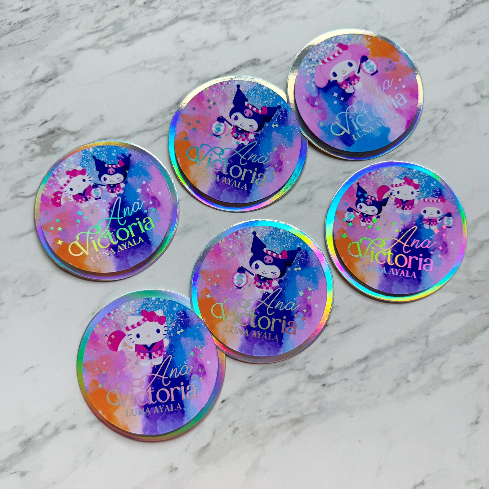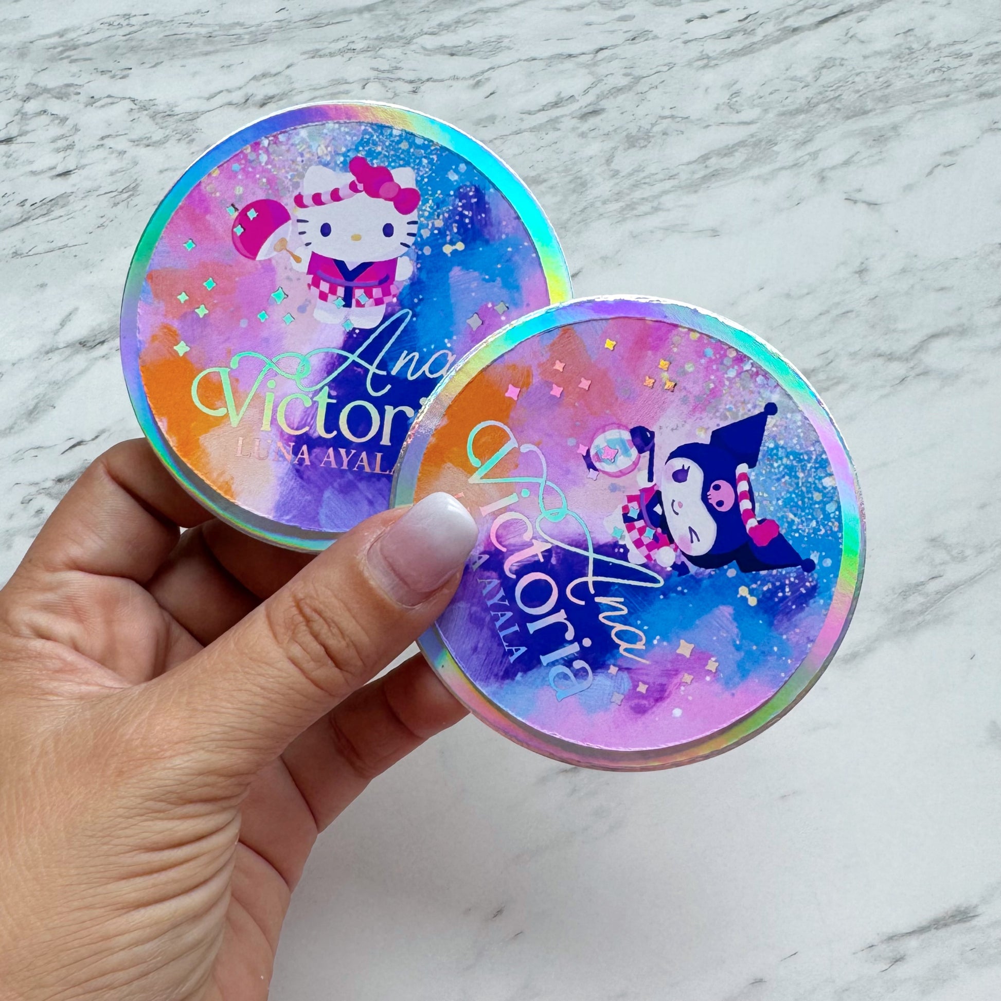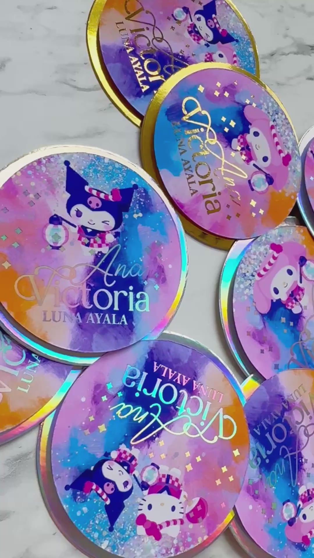 Tarjetas personalizadas con tema de Kitty, Kuromi y My Melody, tal como se ve en la foto, no incluye cambios en el diseño gráfico. La personalización incluye efecto metálico en el nombre (todos iguales).