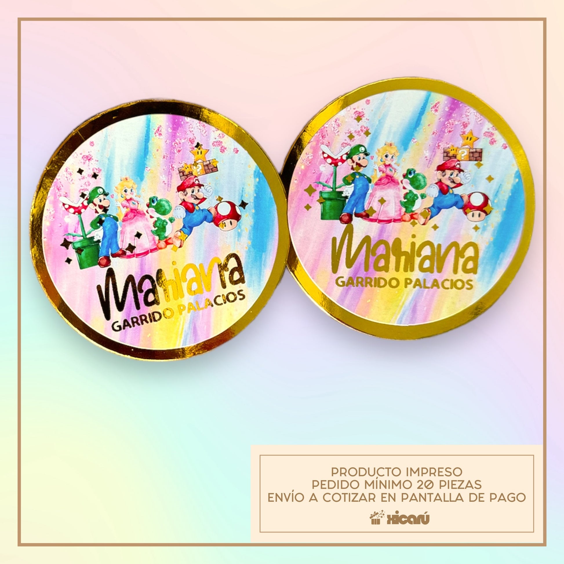 Tarjetas personalizadas con tema de Mario y amigos en tonos pastel, tal como se ve en la foto, no incluye cambios en el diseño gráfico. La personalización incluye efecto metálico en el nombre (todos iguales).