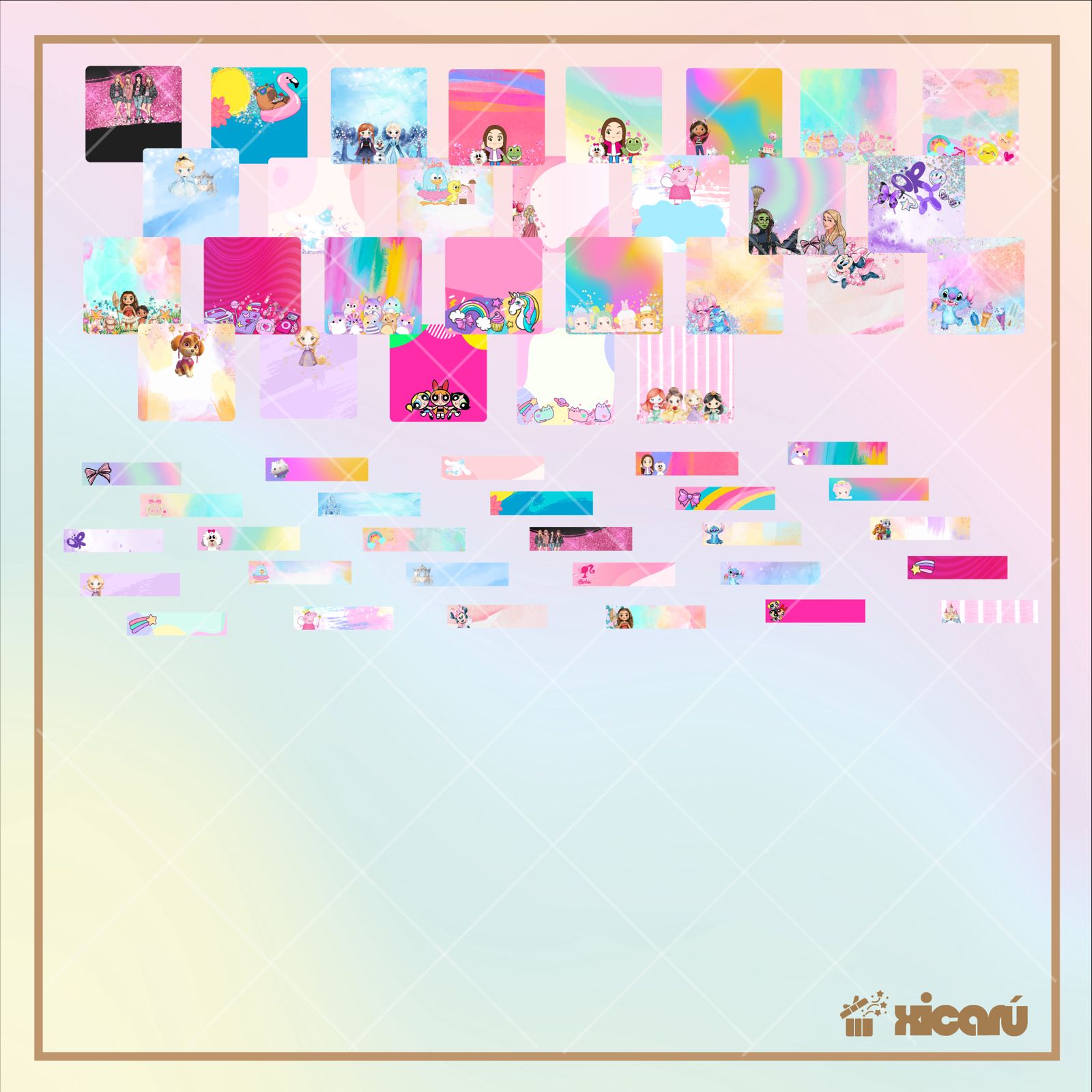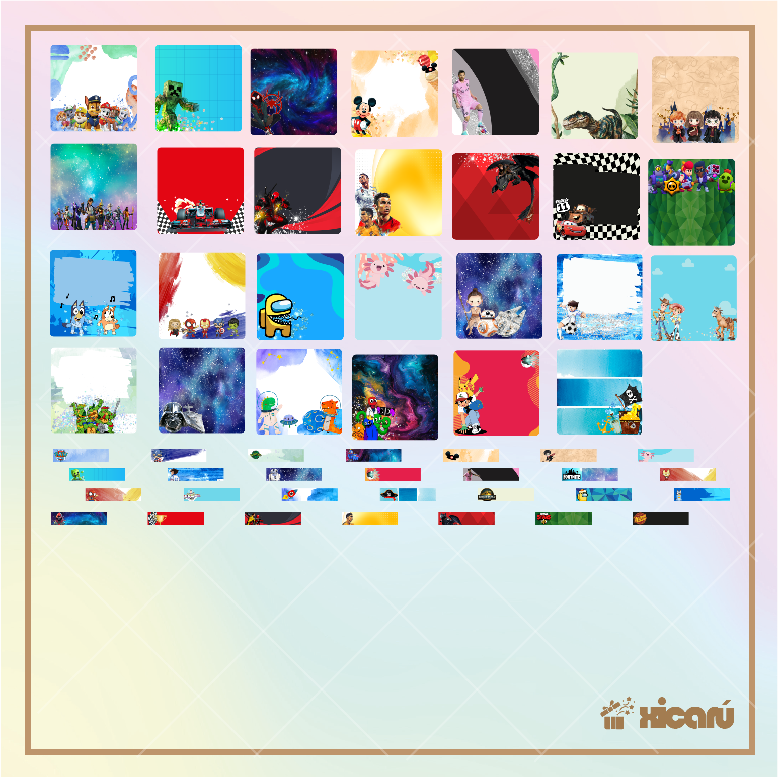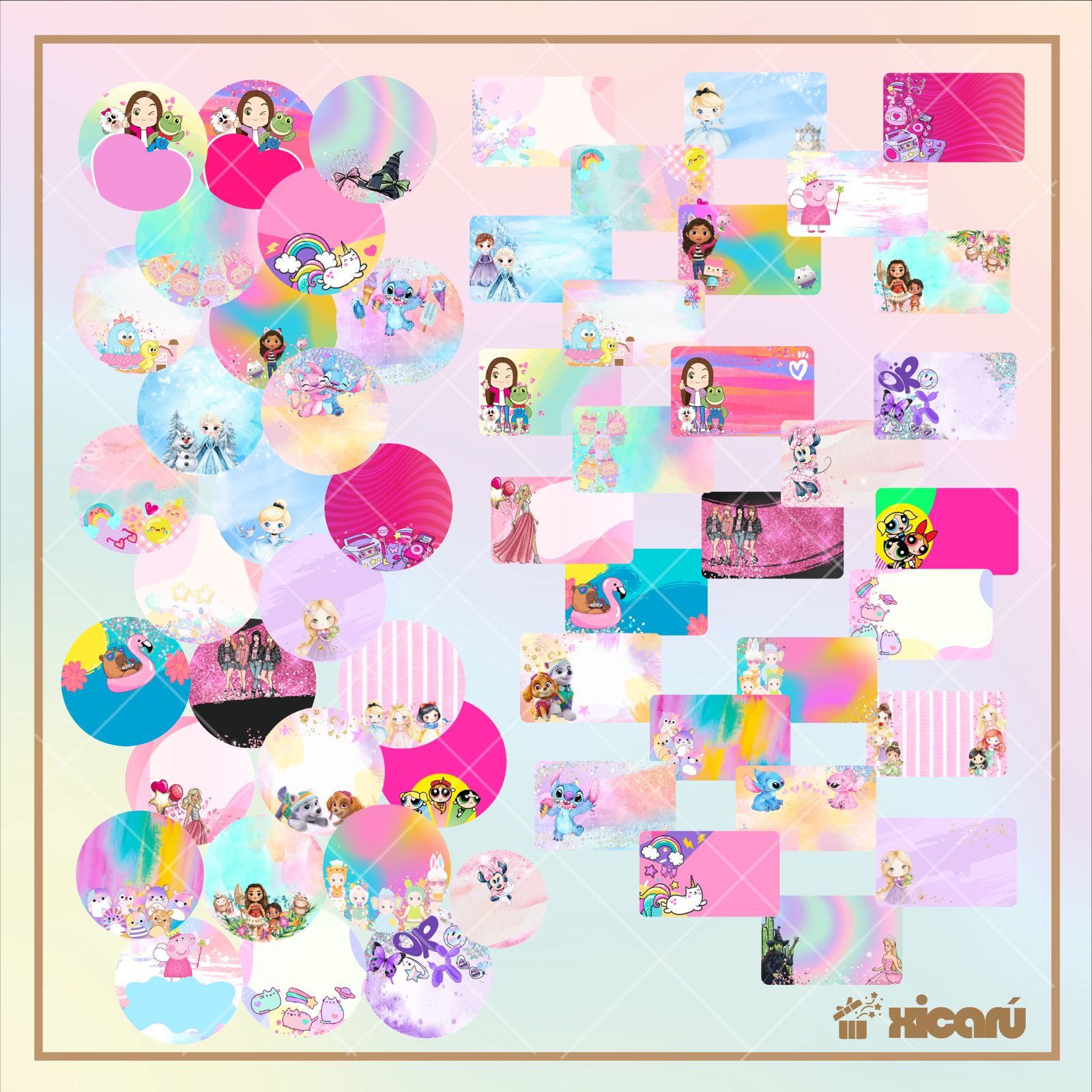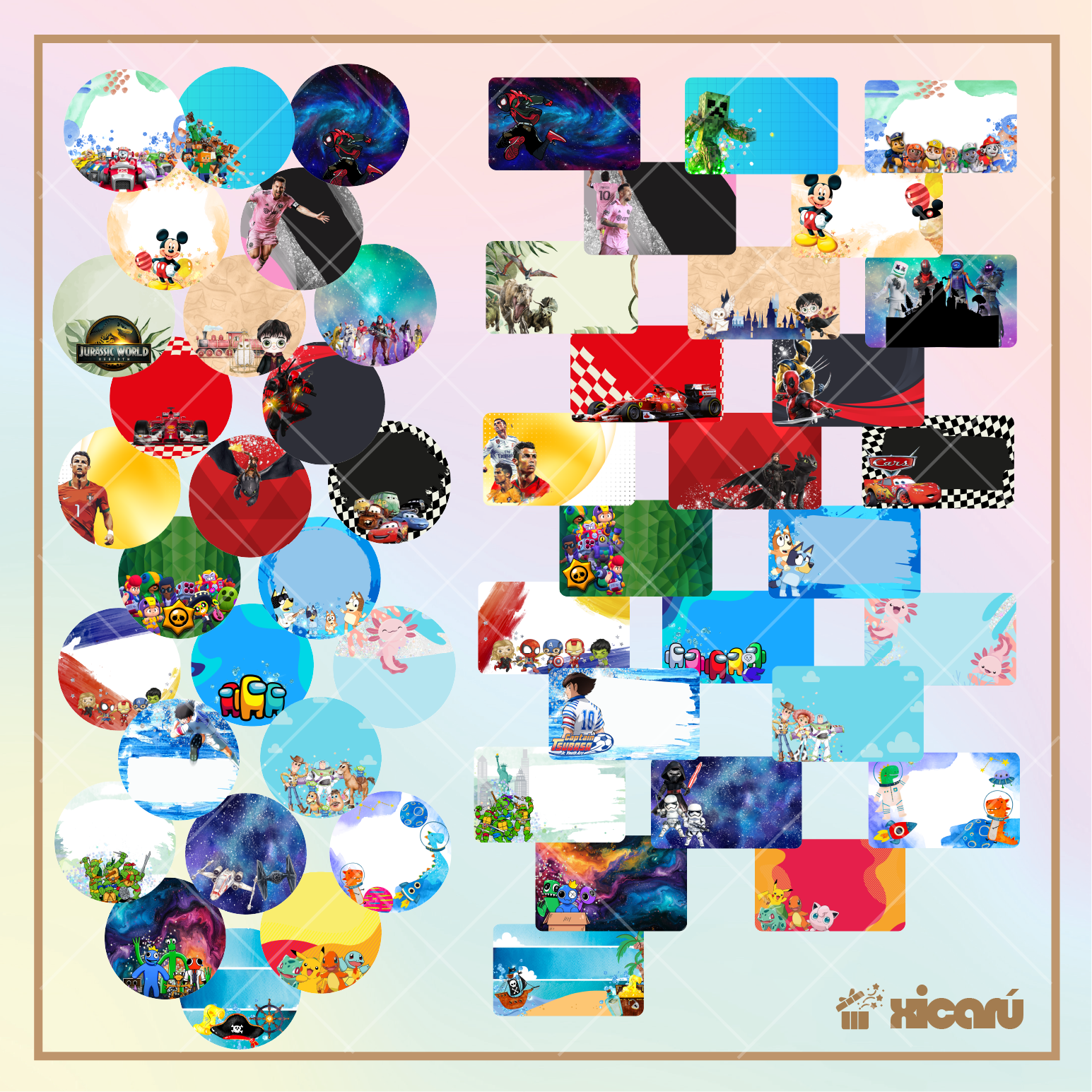 ★ Este artículo incluye 50 diseños (200 PNG en total), 50 en formato rectangular, 50 redondas, 50 para lápices y 50 en formato cuadrado. Listos para personalizar con nombre, imprimir y cortar.