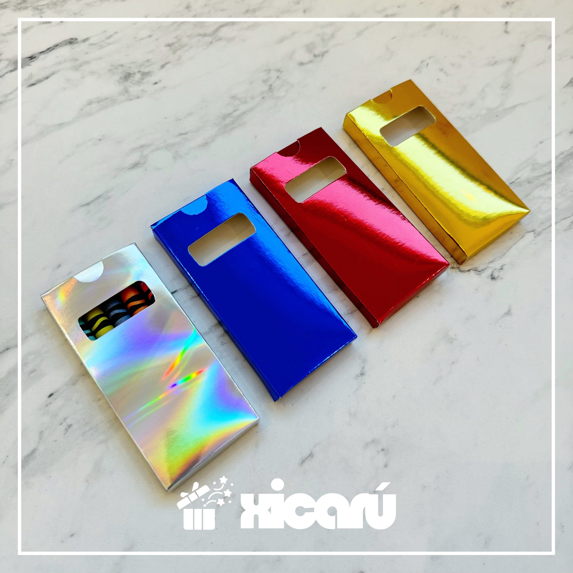 Caja para 5 crayolas de cartulina metálica, diversos colores disponibles.