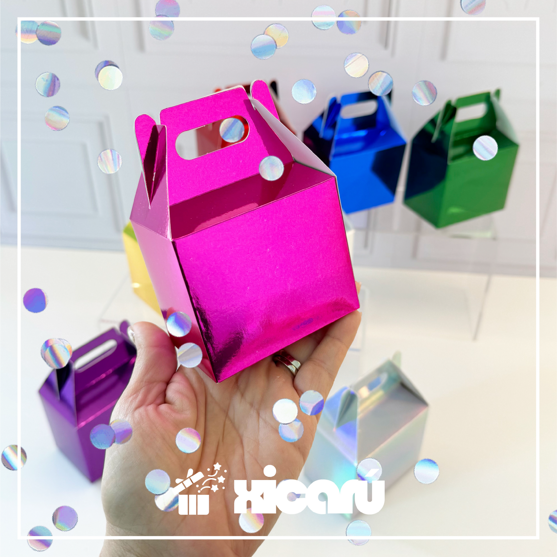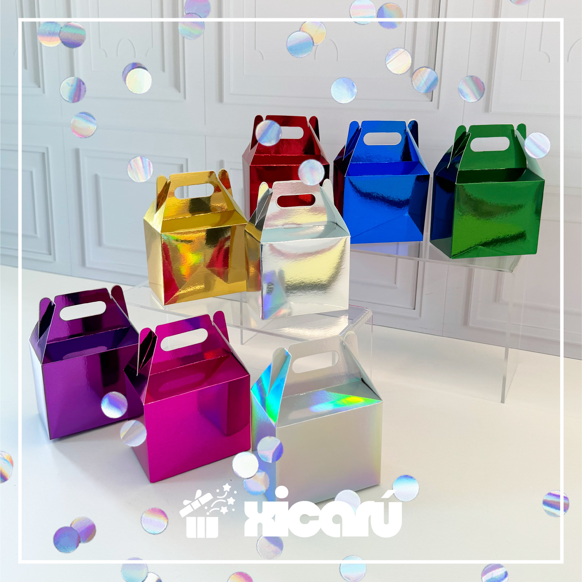 Caja Lunch de cartulina metálica, diversos colores disponibles.