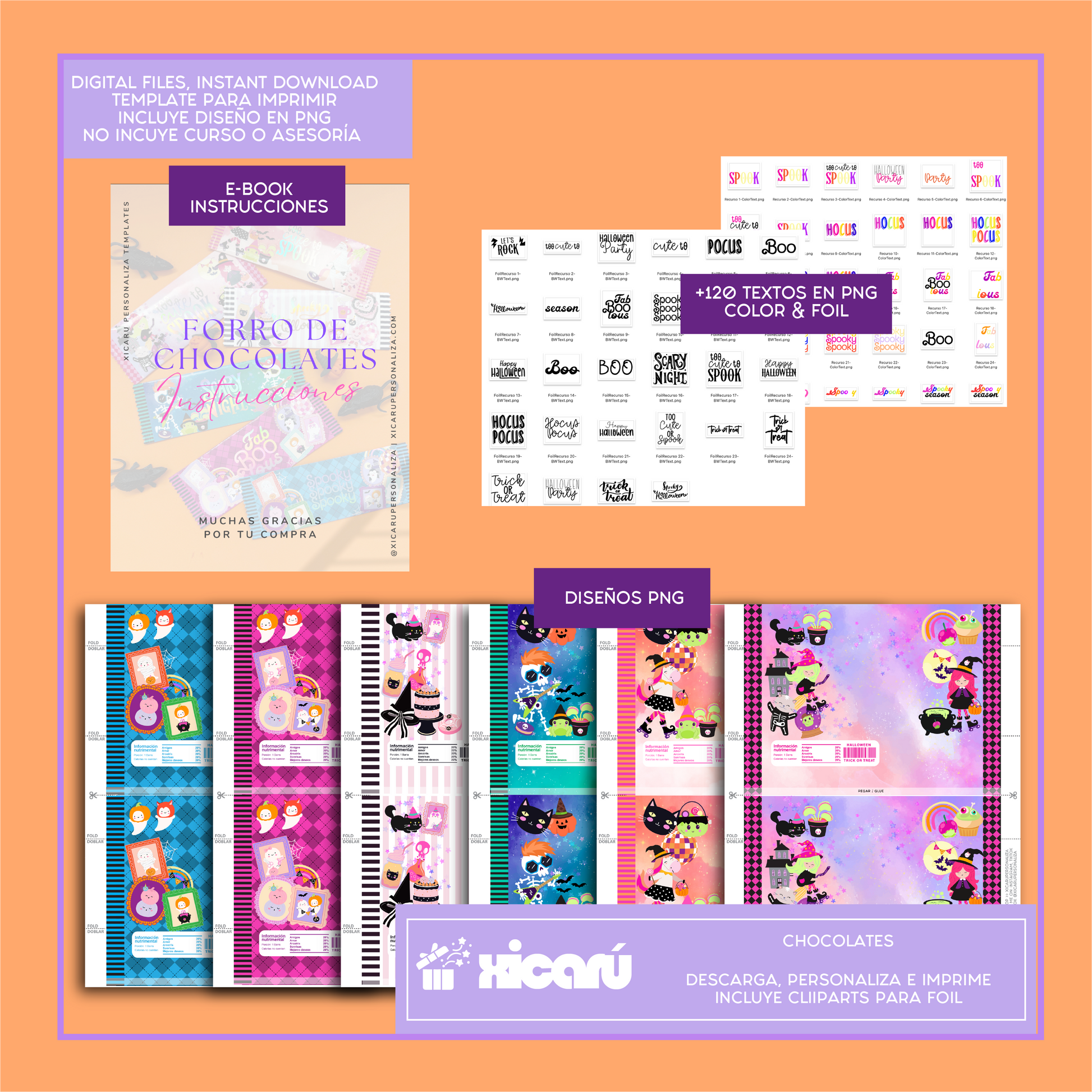★ Seis diseños digitales para forros de chocolates, en formato PNG en RGB, tamaño carta. Archivos PDF tamaño carta, SVG y Ai.