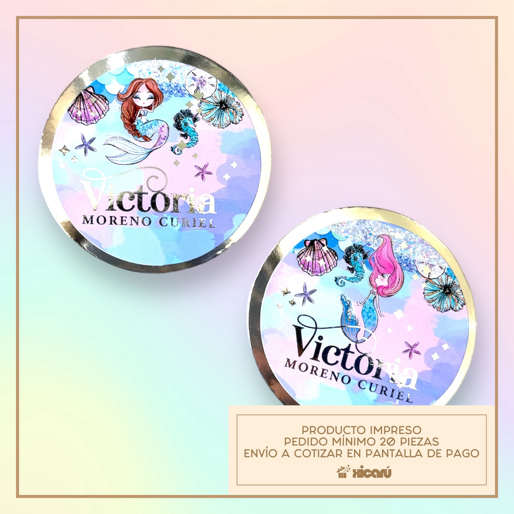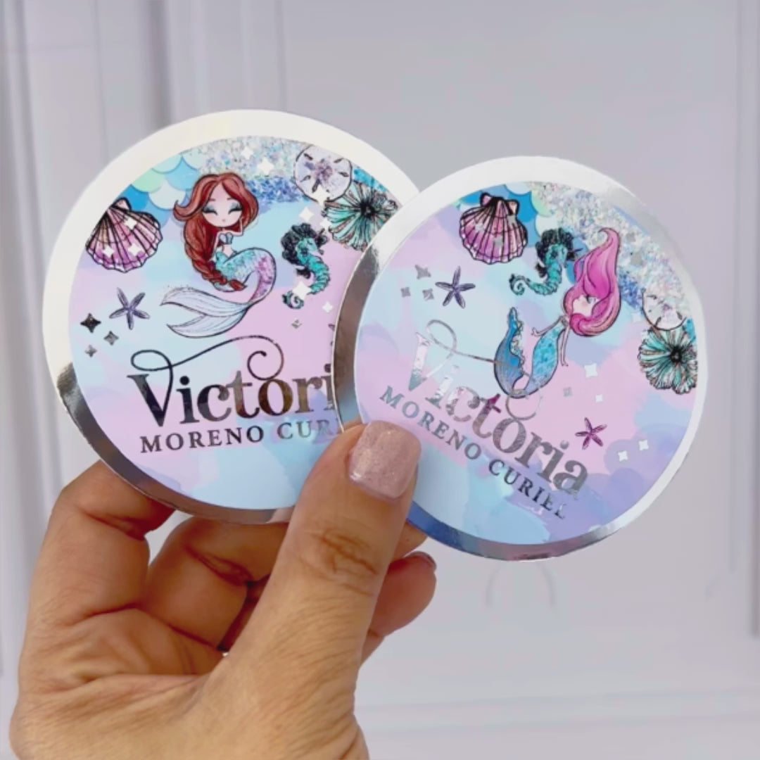 Tarjetas personalizadas con tema de Sirenas, tal como se ve en la foto, no incluye cambios en el diseño gráfico. La personalización incluye efecto metálico en el nombre (todos iguales).
