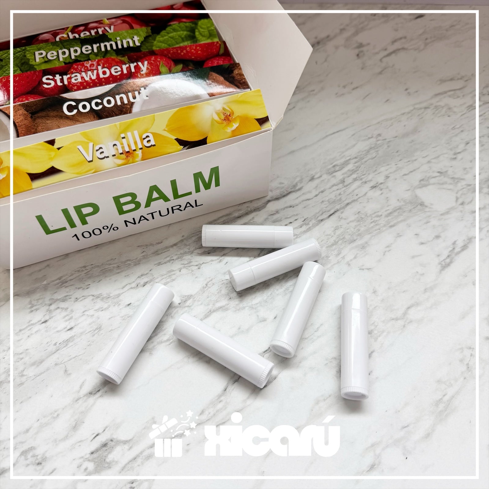 Balsamo natural, ideal para personalizar, variedad de aromas (fresa, cherry, coco, vainilla y menta) Contiene 10 piezas.